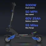 - 𝐏𝐨𝐰𝐞𝐫𝐟𝐮𝐥 𝐏𝐞𝐫𝐟𝐨𝐫𝐦𝐚𝐧𝐜𝐞 𝐟𝐨𝐫 𝐓𝐡𝐫𝐢𝐥𝐥𝐢𝐧𝐠 𝐑𝐢𝐝𝐞𝐬: The RD2 electric scooter, powered by a 5000W peak motor, delivers speeds up to 50 MPH and a 55-mile range with a 60V 25AH battery, perfect for commuters and off-road enthusiasts.