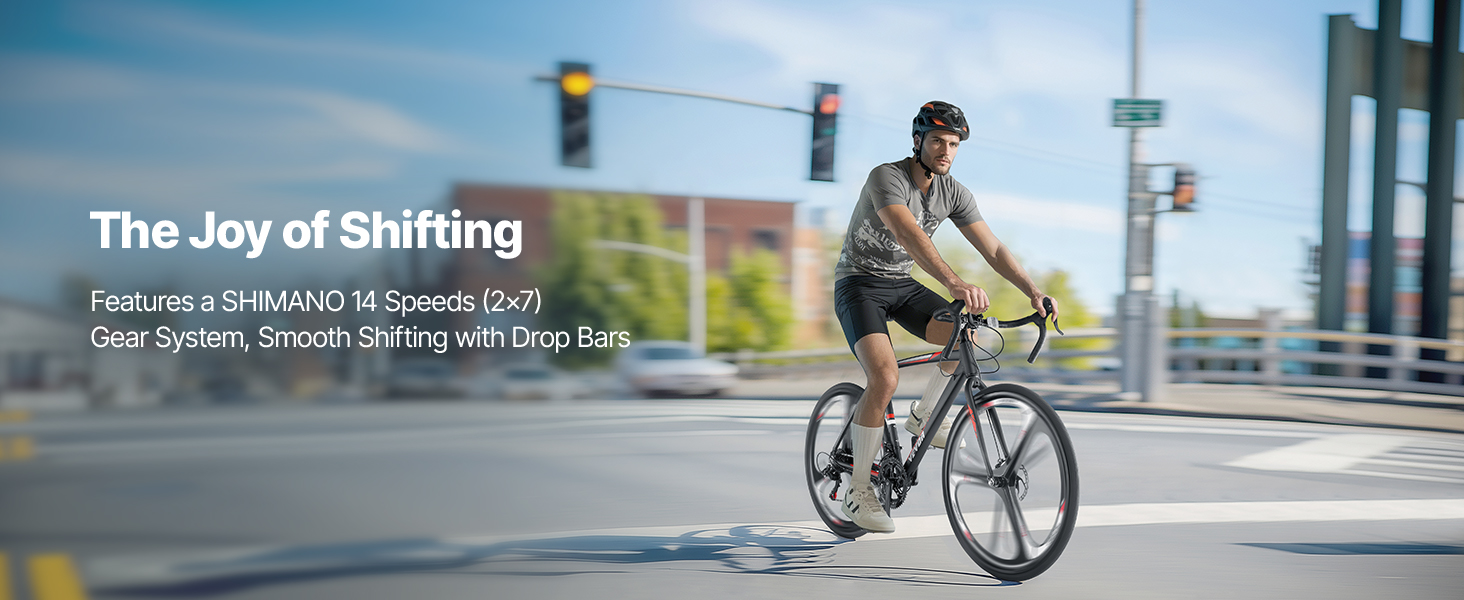 - 14 Speeds Gear System: This road bike for men features a Shimano drivetrain with a 14-speed (2×7) gear system, working seamlessly with front and rear derailleurs to provide smooth gear shifting, energy efficiency, and acceleration. Whether you’re climbing steep hills or cruising downhill, switching gears is effortless